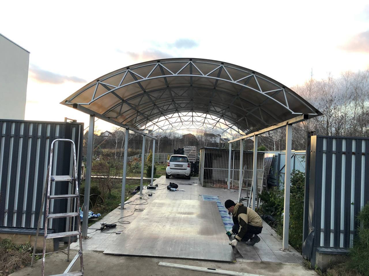 За день на даче изготовили арочный навес 5 на 7 с покрытием поликарбоната. Привезли уже готовые крашенные фермы и весь остальной материал. Все за собой убрали и увезли мусор. Молодцы!